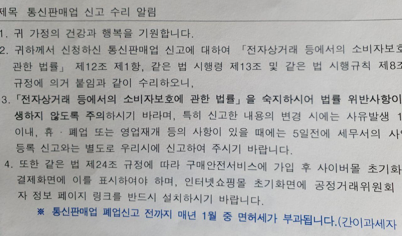 통신판매업 신고증을 교부할 때 안내문에 주의사항으로 나오네요.