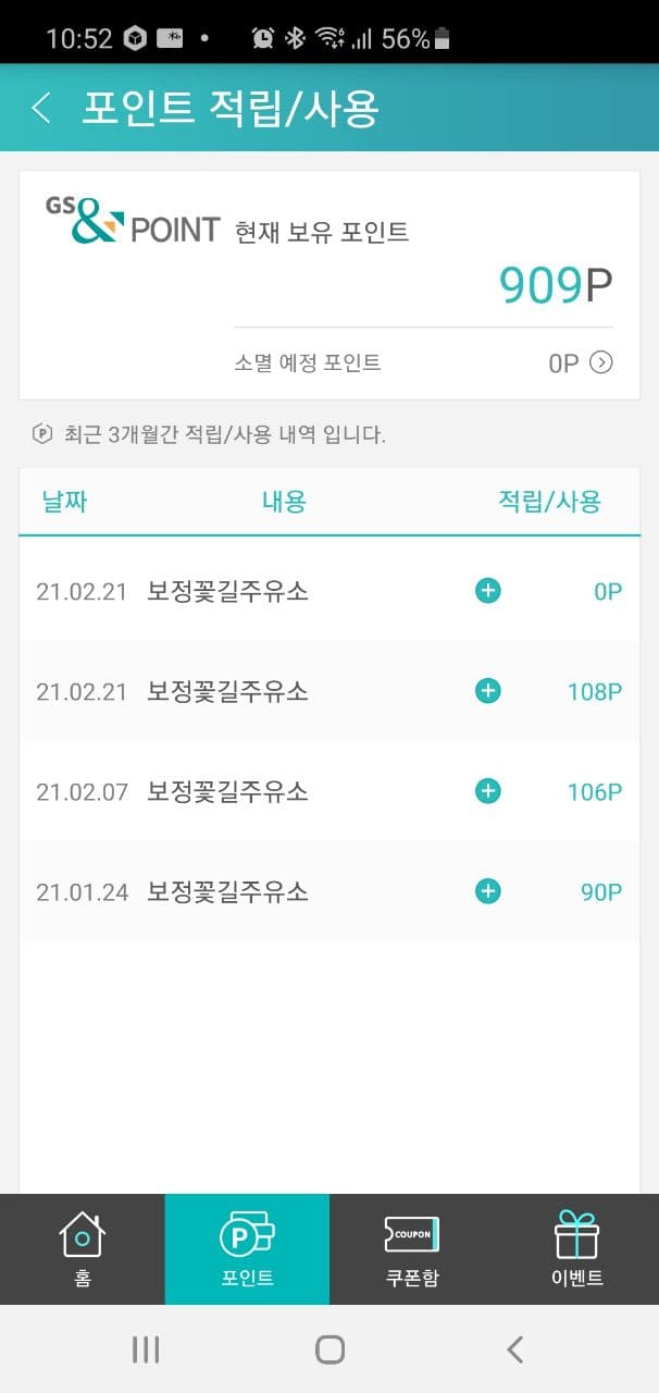 첫 주유에서는 108포인트가 적립되었는데