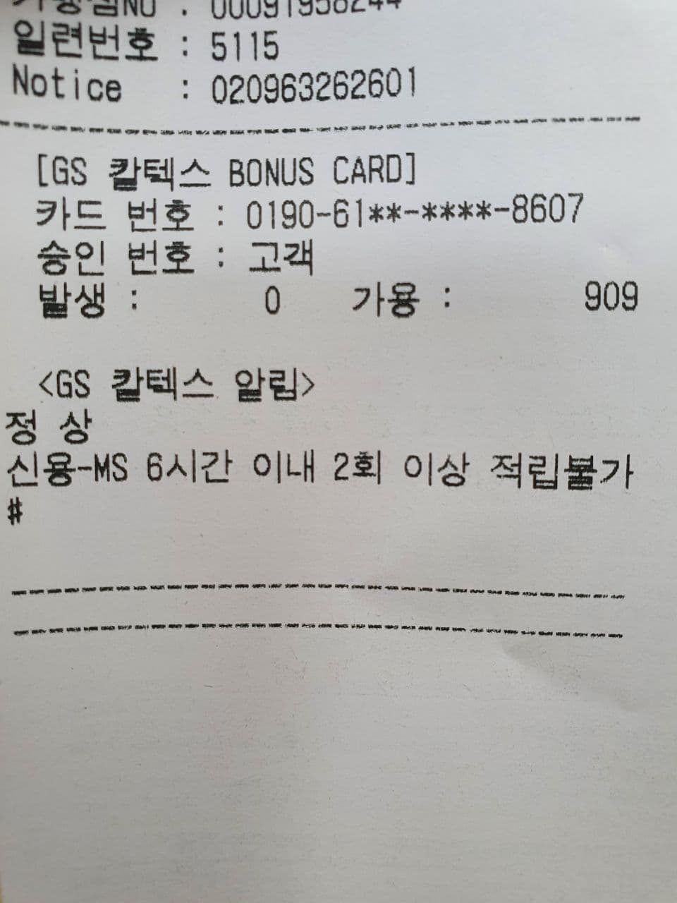 6시간 이내에 2회이상 주유를 하면 보너스카드에 적립을 해주지 않는단다. ㅜㅜ